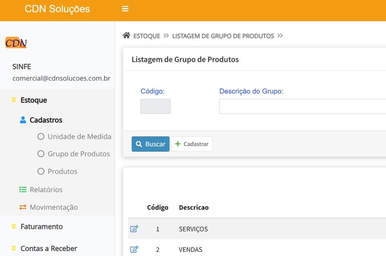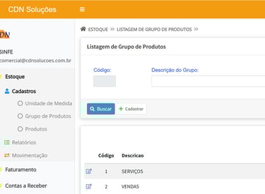 Cadastro, Relatórios diversos, Movimentação de Estoque